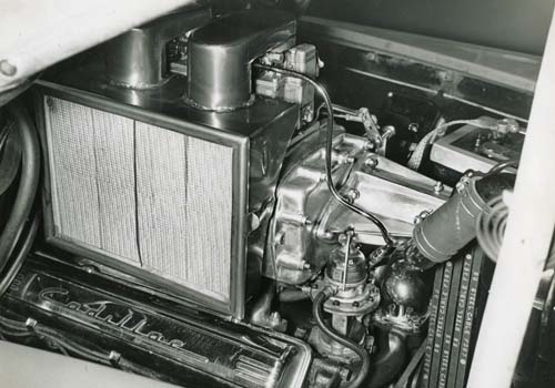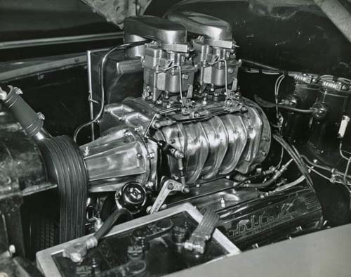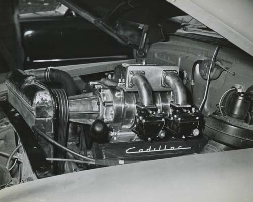 While working night shifts at General Motors Truck & Coach Division located at 2700 Tweedy Blvd., South Gate, CA, Jack was sent to receive factory training on their 2-stroke Detroit Diesel truck engines which incorporated Roots type blowers. Upon completion of the training, Jack designed and built a street blower kit for the Cadillac 331 engine incorporating the GMC 4-71 size blower. The kit included: aluminum intake manifold with cooling fins and pop-off valve, front drive shaft carrier, upper and lower pullys, throttle linkage, and upper carburetor manifold assembly. Matched Good Year belts were also supplied. I believe the photo below shows the first installation on a Cadillac Convertible Business Coupe: